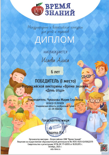 Воспитанница социального приюта "Ручеёк", Исаева Алиса, приняла участие во всероссийской викторине " Время знаний",приуроченной к празднику "День отца" 💙